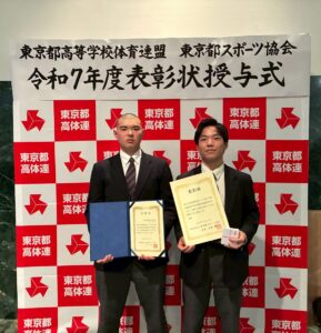 この功績に対し、東京都高等学校体育連盟および東京都スポーツ協会より表彰を受け、国立オリンピック記念青少年総合センター大ホールにて授与式が行われました。